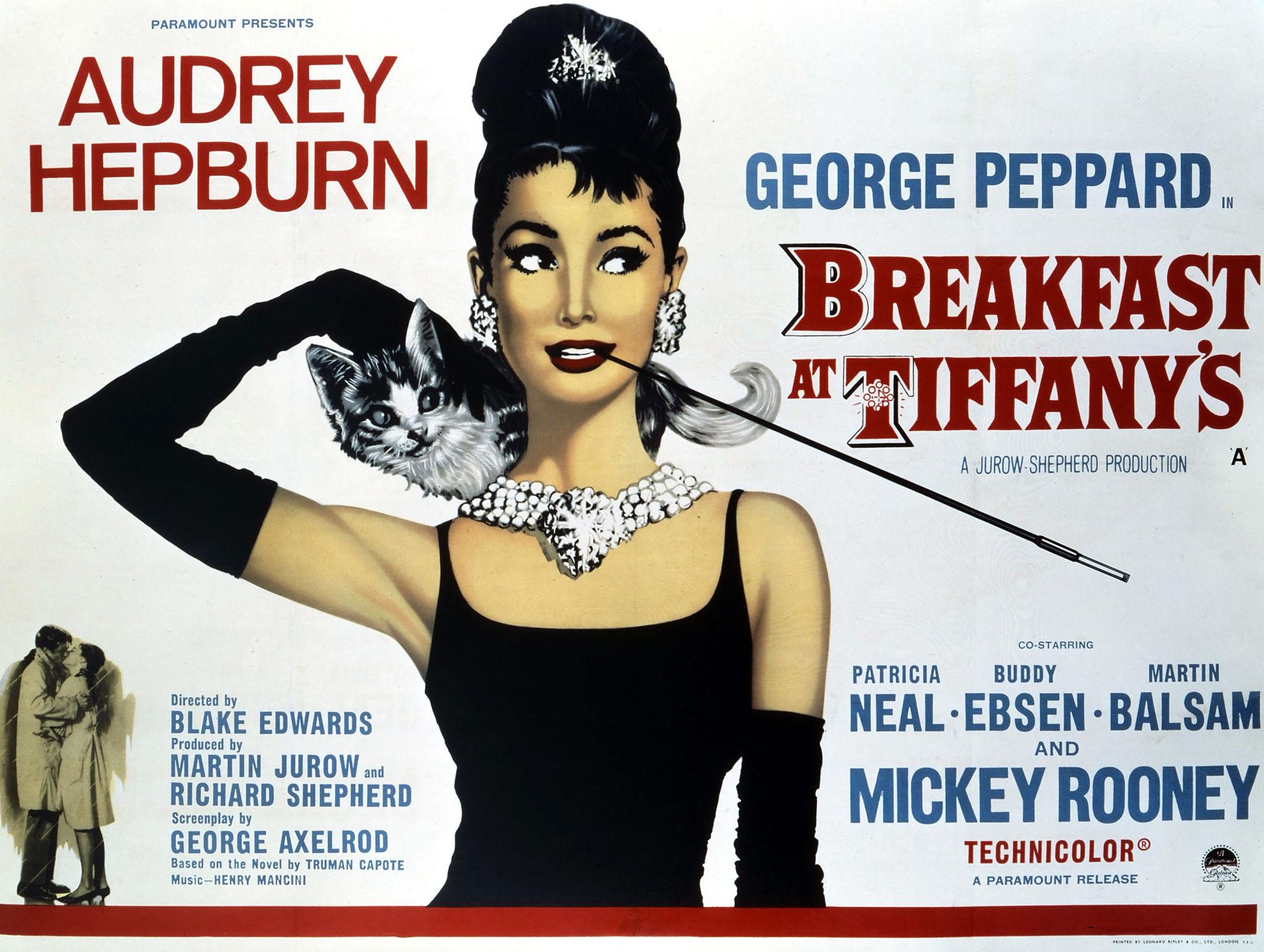 뉴욕 새벽 거리, 검은 드레스를 입은 **홀리 골라이틀리**가 보석상 티파니 앞에서 빵을 먹으며 쇼윈도를 바라봅니다.